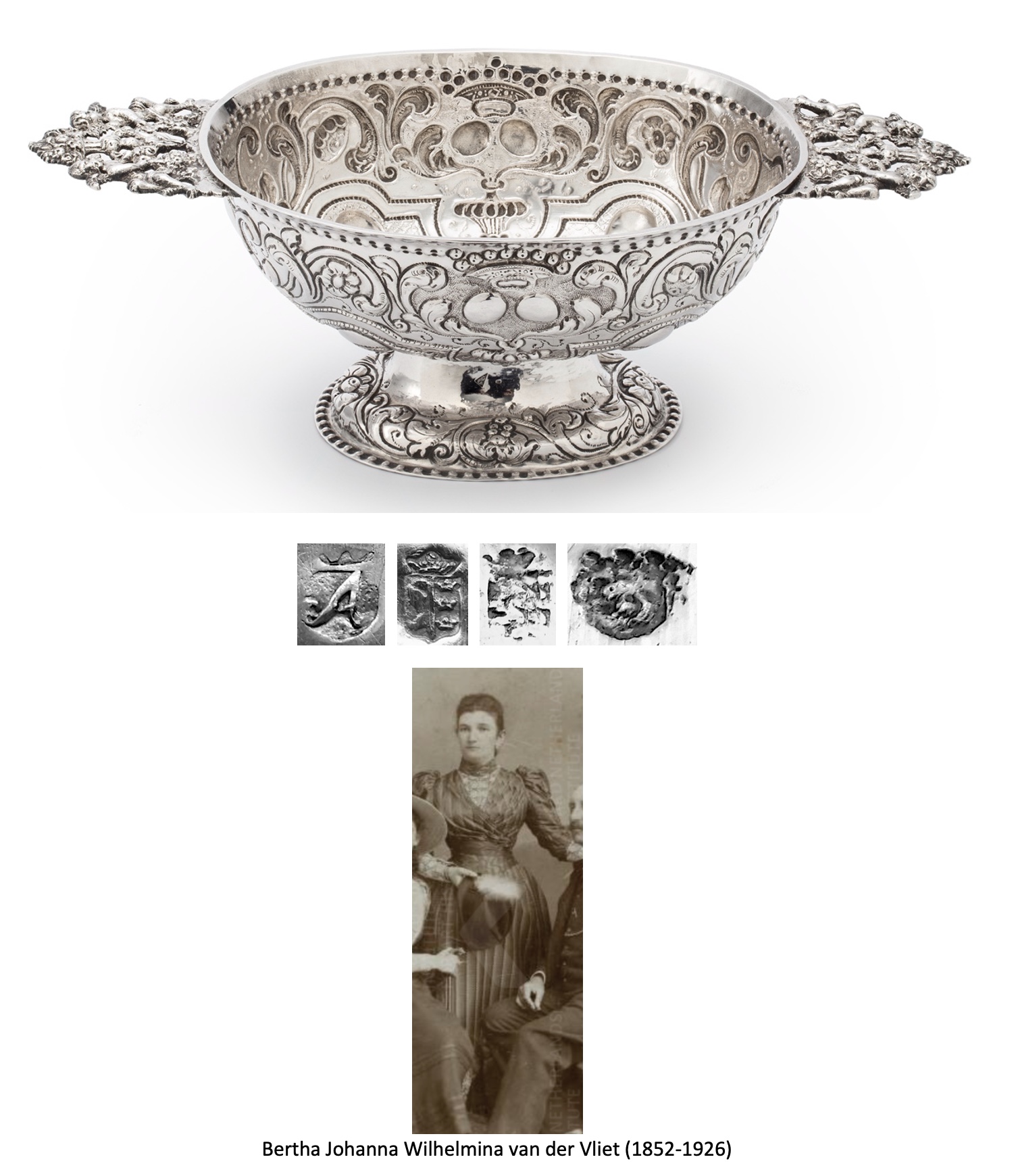 In literature on antique silver only this bowl by this master is recorded. It is possible that more objects by this anonymous master have been preserved. Unfortunately, they have not been not recorded in literature. Voet Jr. stated in 1932 that the date letter had been misstruck, but this is not correct. It is the lion that has been misstruck. in 1932 Voet Jr. recorded as provenance, Mrs. Bijleveld-van der Vliet. Bertha Johanna Wilhelmina van der Vliet (1852-1926) was married to Emil Pieter Hendrik Marie Bijleveld. From 1885 the couple lived in the well-known Belvedere estate in Overveen. Belvedere came into her possession by inheritance. After the childless death of Willem Borski III (1834-1884), in 1884, Belvedere passed to his eldest sister Mrs. D. van der Vliet-Borski. From 1885 her daughter B.J.W. Bijleveld-Van der Vliet lived in Belvedere.