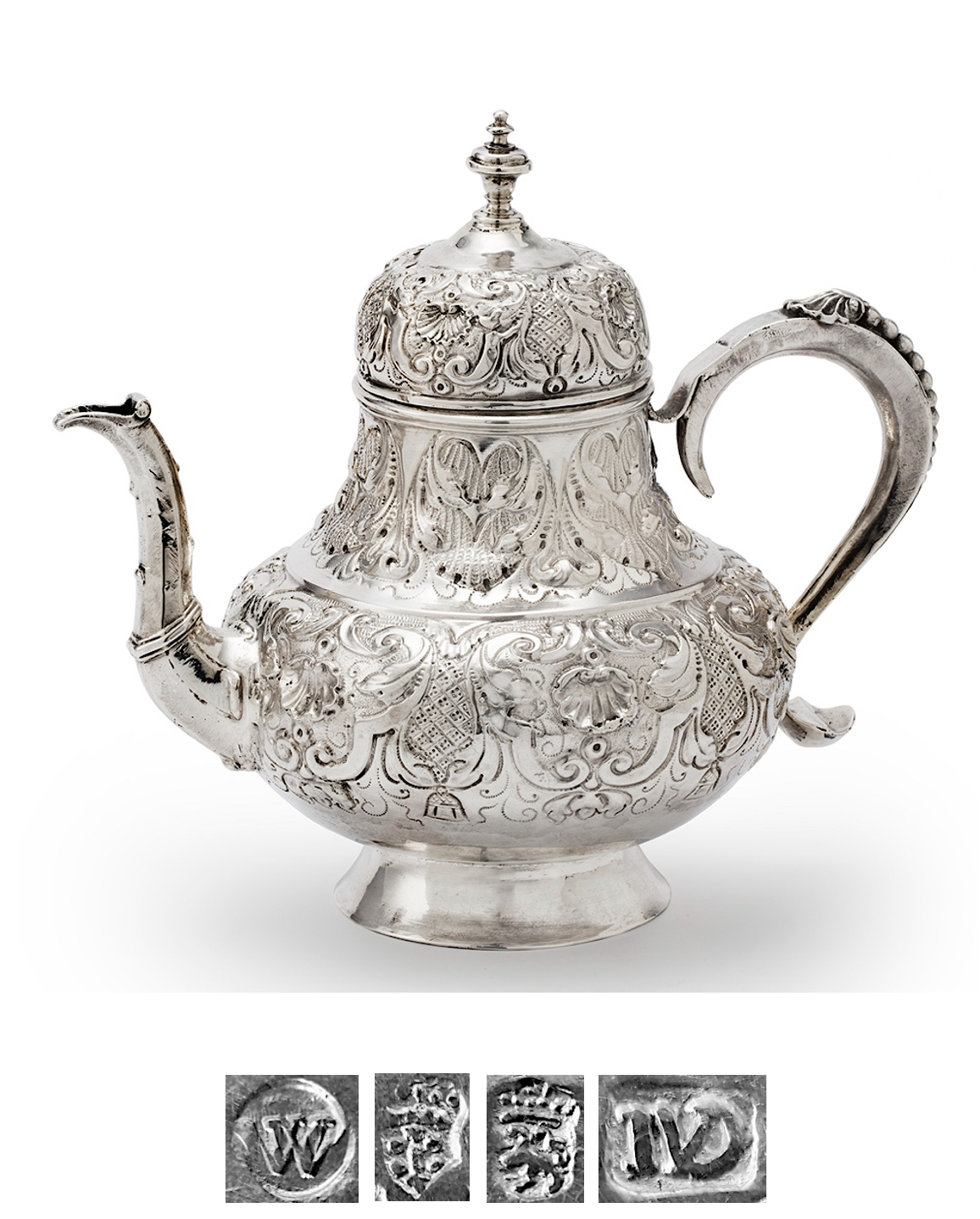 The baluster-shaped teapot, whose body and detachable lid are chased with Daniel Marot motifs, such as shells, lambrequins and scrolling foliage, stands elevated on a round plain base. The silver volute-shaped handle is applied on top with a shell motif followed by a sloping pearl border. The slightly curved spout is faceted. On the inside of the base the initials MPVD and WAV are engraved. Fully marked on the reverse of the body and displaying an assay stripe.