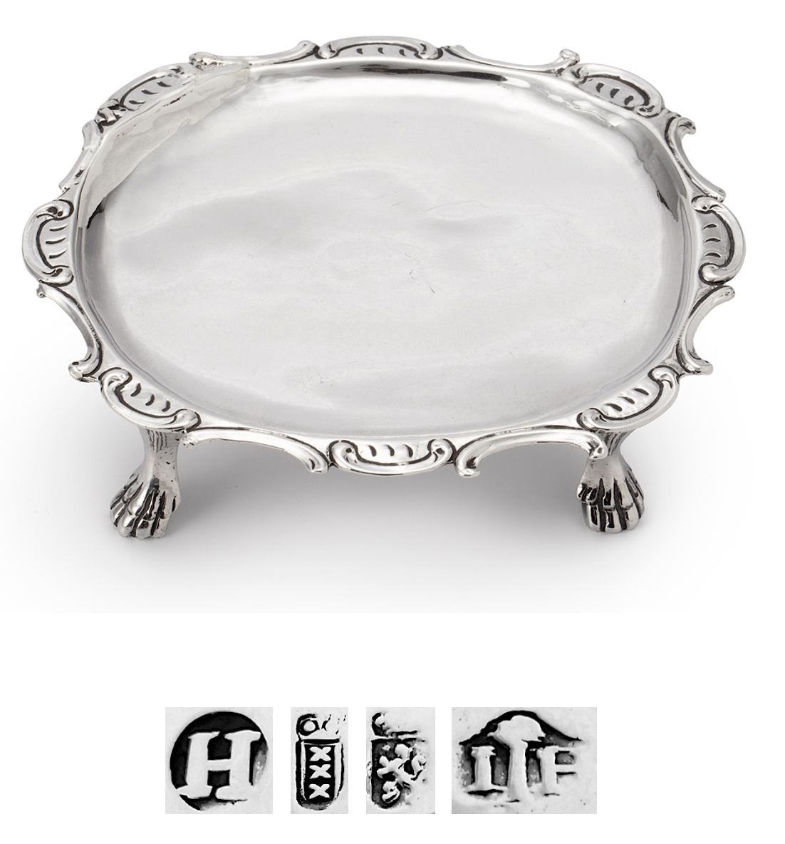 Initially Johannes Horstman was recorded in literature as Johannes Hartsman. However it turns out that the correct name of the master-silversmith with maker’s mark IH of either side of a tree in a rectangle must be Johannes Horstman. Johannes Horstman (1721-1804) was the son of Jan Horstman and Alida Bruyn, who were married in 1717. In 1758 Johannes Horstman became a burgher of the city of Amsterdam and probably shortly afterwards he enrolled in the Amsterdam silversmiths’ guild. He was a prolific service worker of salvers, bread baskets, sweetmeat baskets and tea services. Somewhere between 1790 and 1795 he stopped working.