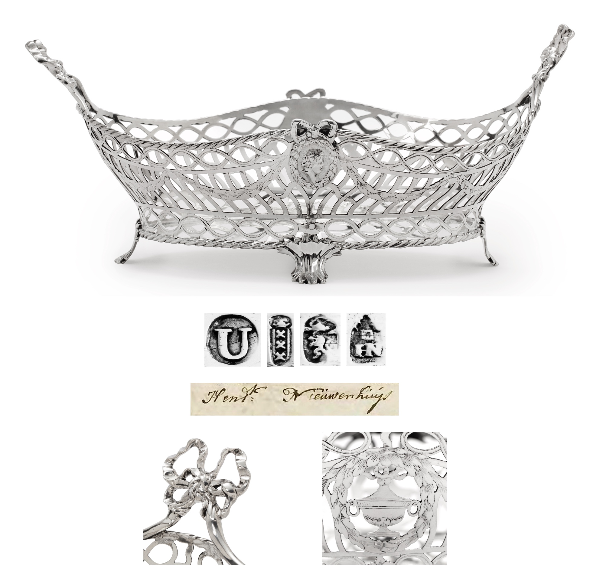 The design of this basket in the neoclassical style, using garlands and ovals with portrait medallions, is rather early. It is possible that the designs of Robert Adam (1728-1792) may have been the source of inspiration. Hendrik Nieuwenhuys is certainly not the first silversmith to use this style. The earliest example in this style may be a silver basket made by his fellow townsman Reinier Brandt in 1774. Johannes Schiotling also made a basket in this style during the same period. Hendrik certainly did not invent the design. His father also worked in this style, as evidenced by a silver basket made in 1777. Similar leaf-shaped feet and garden vases can be found in it. However, the difference is that both Brandt and Schiotling, as well as Harmanus Nieuwenhuys, his father, applied the ornaments, whereas Hendrik engraved the garlands and garden vases on the basket. All baskets by these silversmiths from Amsterdam have similar leaf-shaped feet. Hendrik certainly had learned the trade in his father's workshop. After the death of his father Harmanus Nieuwenhuys on October 25, 1763, Hendrik continued his father's silversmithing business. It was his father's wish, as described in his will, "that upon his death his affairs shall be continued by his eldest son, Hendrik Nieuwenhuys...". Hendrik became a citizen of Amsterdam on November 1, 1763, and presumably also became a registered master silversmith at the guild around the same time. The attribution of the master's mark HN monogram in the outline of a house is telling: the initials and the shape of a house refer to his name. In 1767, Hendrik married Margaretha Johanna, daughter of Jacobus des Ruelles and Maria Kok. Like his father, he probably worked for the firm Peirolet, retailers in Amsterdam. In 1786, Hendrik Nieuwenhuys himself was listed as a shopkeeper. In 1799, this firm was located on Cloveniers Burgwal near Nieuwmarkt in 't Gekroonde Cromhout. As a prolific craftsman, several silver objects made by him are known, such as trays, candlesticks, tobacco jars, teapots, and baskets. Hendrik was related to several Amsterdam silversmiths, such as Benten, Verschuur, and Van Wijk.