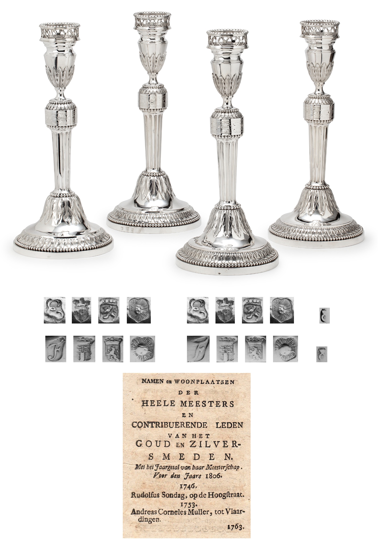 The maker's mark 'a sun' (in various variants) belonged to the Rotterdam silversmith Rudolph Sondag (1726-1812). He was born on 4 February 1726, the son of Jan Sondag and Barbara Boelhorst. In 1747 he married Johanna van Essen (1725-1799), also from Rotterdam. According to a booklet with names of members of the Rotterdam silversmiths’ guild, dated 1806, Rudolph (Rudolphus) Sondag had become a master in the silversmiths’ guild in 1746 and stopped working in 1812. His name and his maker’s mark also appeared on a list of 1768, number 29. He lived with his family in Rotterdam, moving from Kipstraat to Westerwagenstraat and Hoogstraat. Rudolph Sondag reached the ripe old age of 86, and was buried on 19 November 1812. His son Johannes Petrus Sondag, maker’s mark IPS in oval, worked as a silversmith in Rotterdam from 1784 till circa 1801, the year he went bankrupt. In 1813 he picked up his profession as a silversmith again.