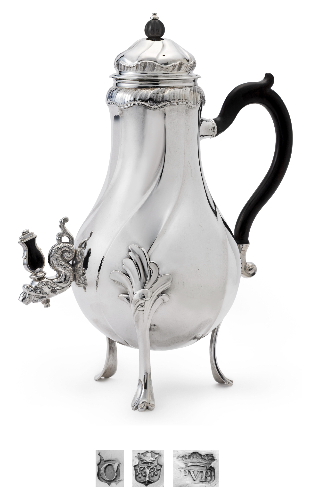 The spirally- fluted baluster body is raised on three scroll and foliate supports. The domed cover with ventilation hole has a black wood finial. The spout is shaped as a dolphin. The scroll wood handle terminates in a silver scroll. Fully marked at the base.