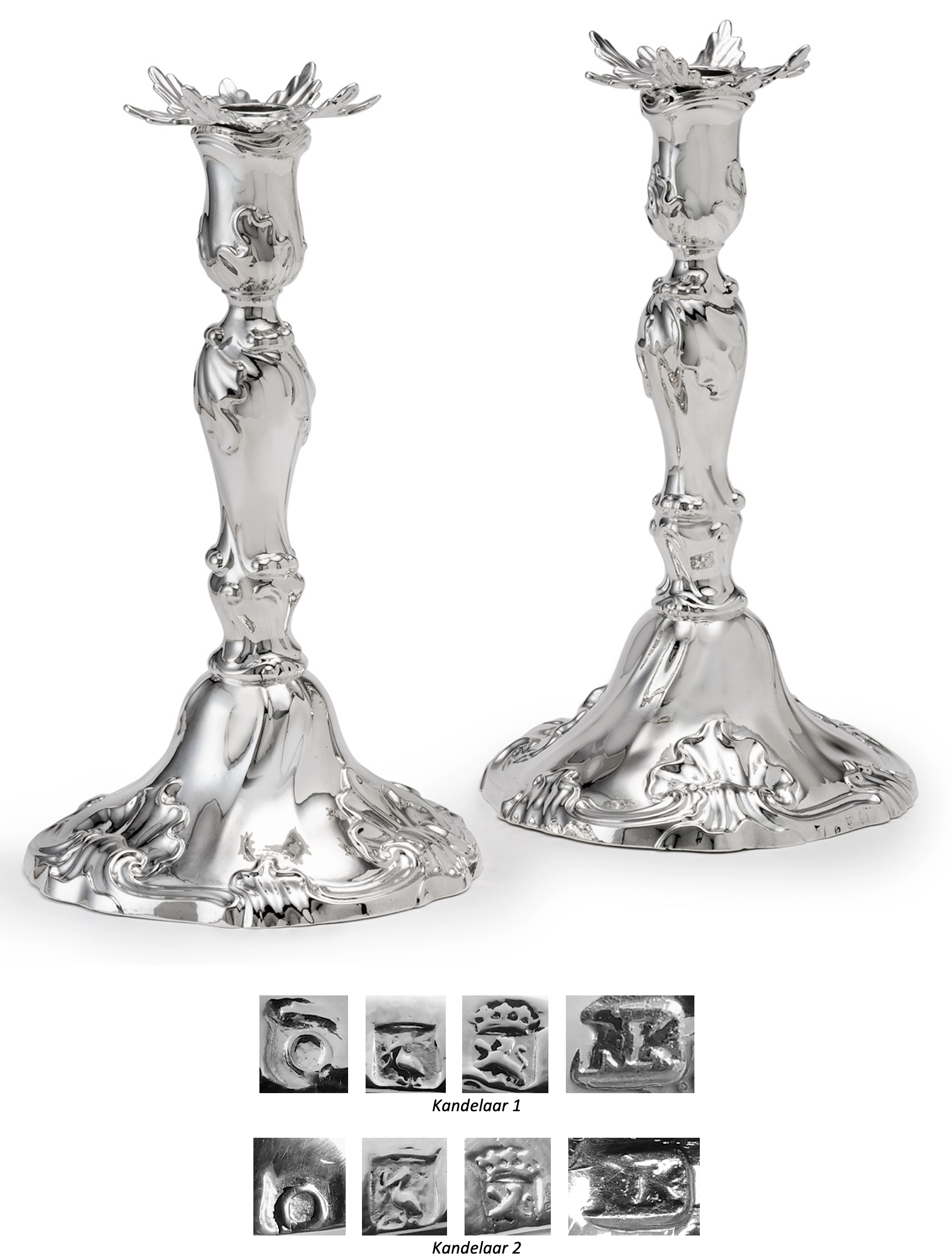 De gegoten kandelaars zijn getorst en gedecoreerd met schelp- en bladmotieven. De afneembare vetvangers worden gevormd door uitstaand bladwerk. Volledig gekeurd op de voetrand en voorzien van een trembleersteek aan de binnenzijde van de voetwelving.