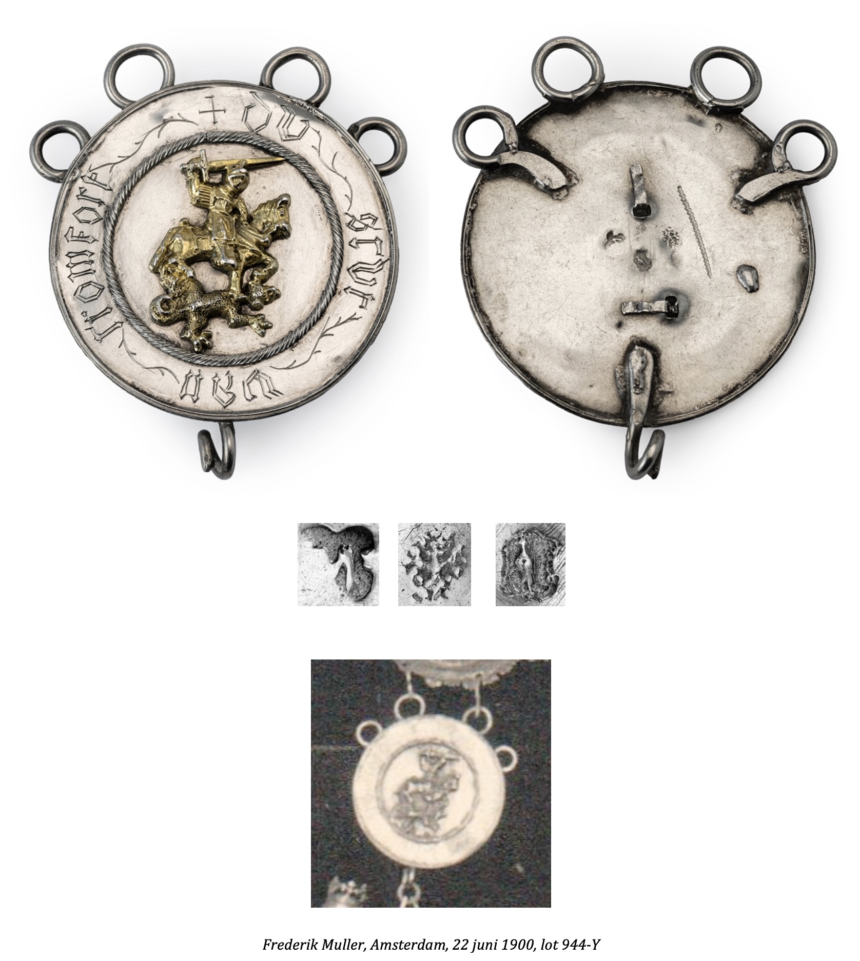 The sixteenth-century circular patron sign of the marksmen’s guild of Cromvoirt is engraved on the outer rim with the text '+ DV SCVT VAN CROMFORT' in Gothic capitals. In the middle, surrounded by a cable rim, the silver-gilt figure of St. George on horseback, slaying the dragon, is applied. Twigs are engraved between the words. Four circular suspension eyes are mounted at the top and a suspension hook below. Fully marked at the reverse and displaying an assay stripe.
