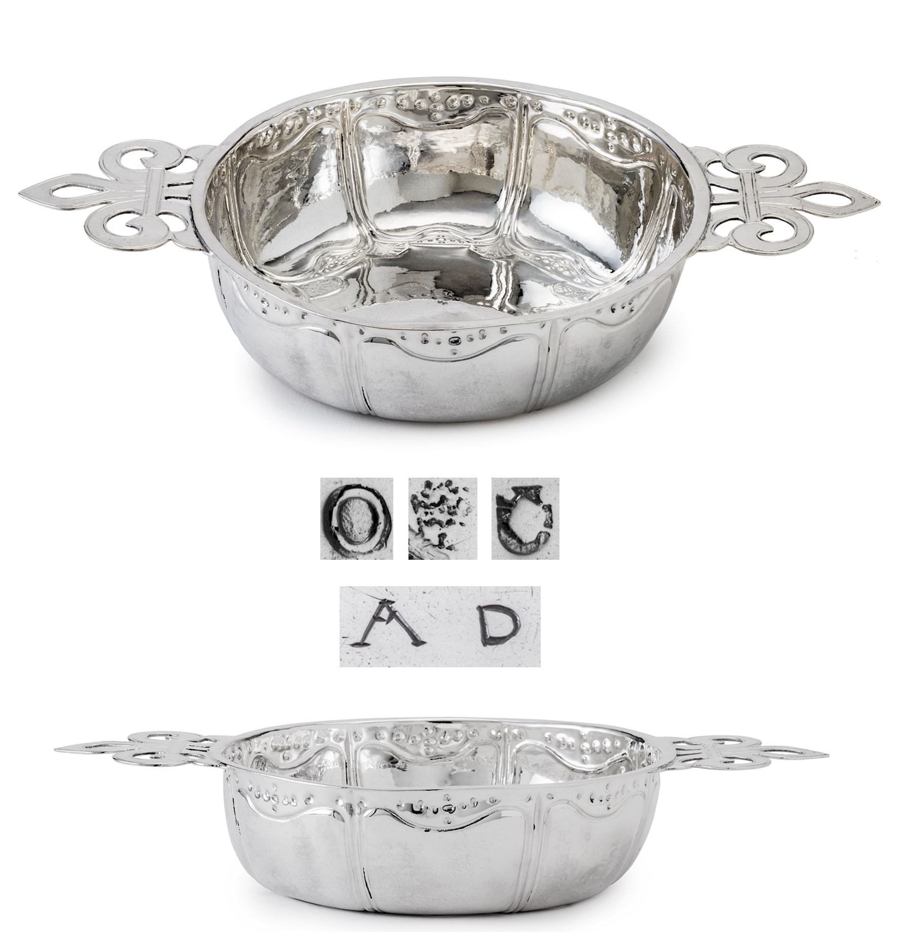 The circular bowl with flat openwork and engraved handles on both sides in the shape of stylized lilies is surrounded by chased lobate panels, between a dotted decoration, alternating on the bottom rim with chased stylized foliage. Fully marked at the reverse and displaying assay stripes on the reverse of the bowl and the handles.